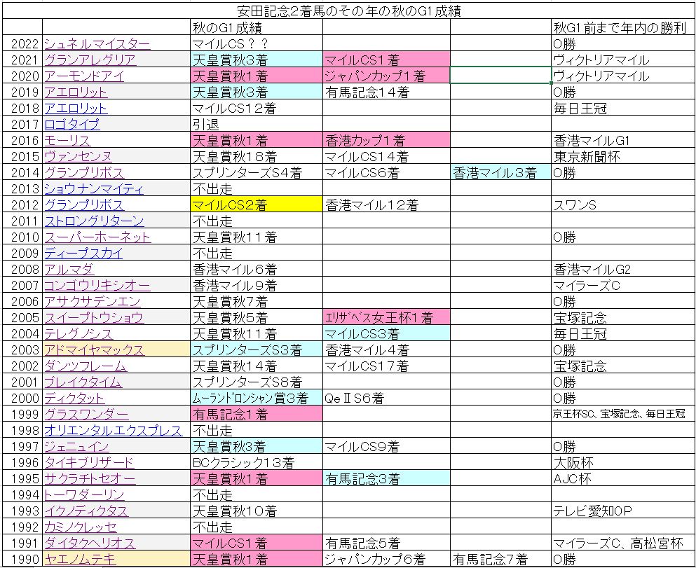 年内に勝っていない馬が安田記念2着になっていることは多く、その年の秋はG1で連対できたことがほぼありません。(皐月賞馬のヤエノムテキのみ)