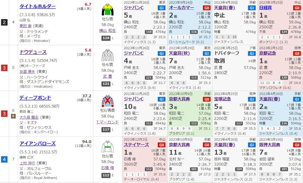 秋1戦のみのフィエールマンとダイワスカーレットは年内も2戦しかしておらず、ジャスティンパレスは今年4戦しています。多少の違いかもしれませんが、もしかしたら影響があるかもしれません。