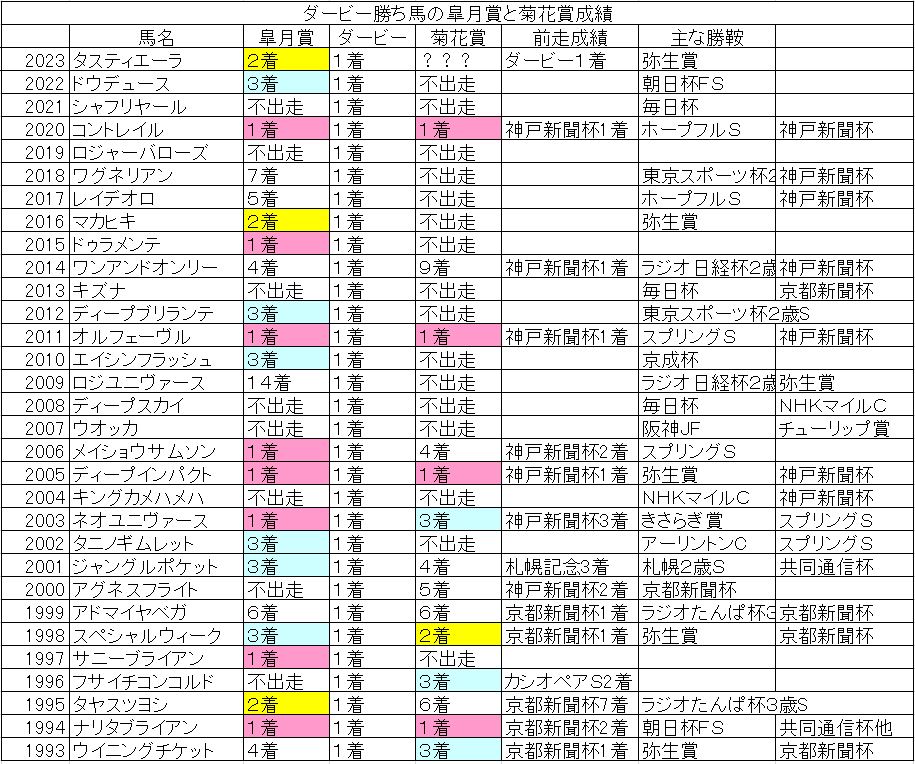 これは皐月賞をとれなかったダービー馬はダービーで120%の仕上げをしたために秋に疲れが出るのではないかとデータ的に感じております。