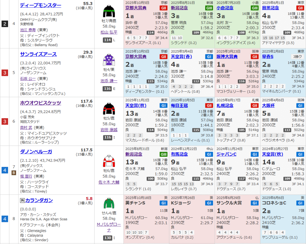 格が高い馬しか来れないレースで、G1連対経験がない馬は前走で京都大賞典かアルゼンチン共和国杯を勝っていないと厳しいと見ています。(例外2頭)