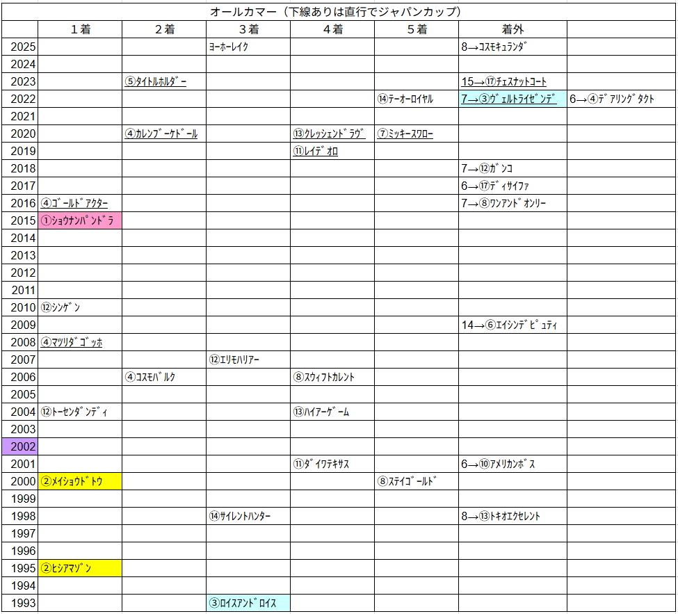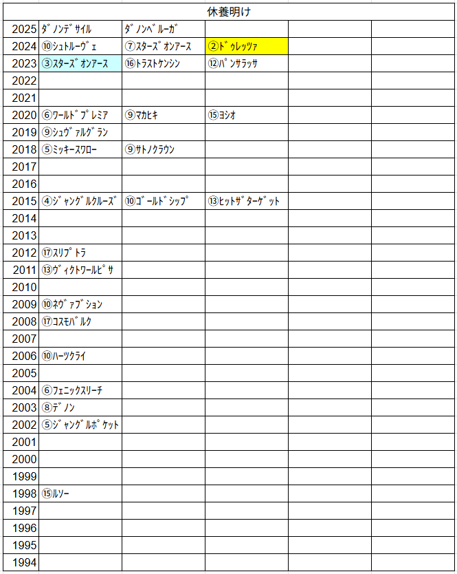 休養明けはほぼ来ないですが、一昨年スターズオンアースが3着に入り去年はドゥレッツァが2着に入りました。2,3着は考えなくてはいけないと思います。