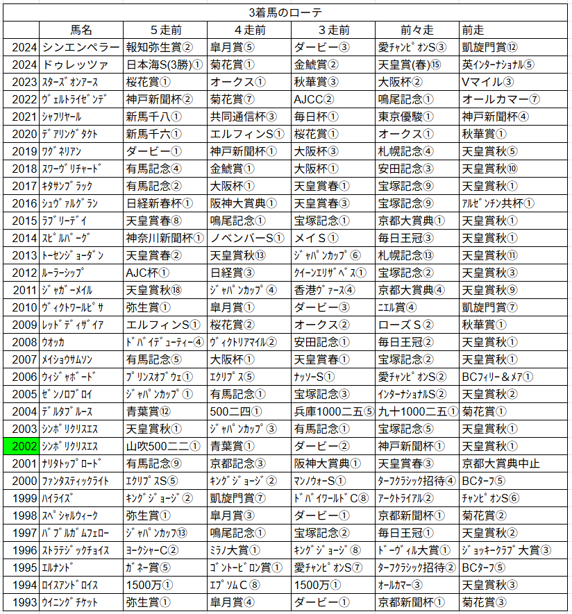 天皇賞春はあまり関連がないようです。春の天皇賞以外に2000m~2500mのG1で連対している必要があると思われます。