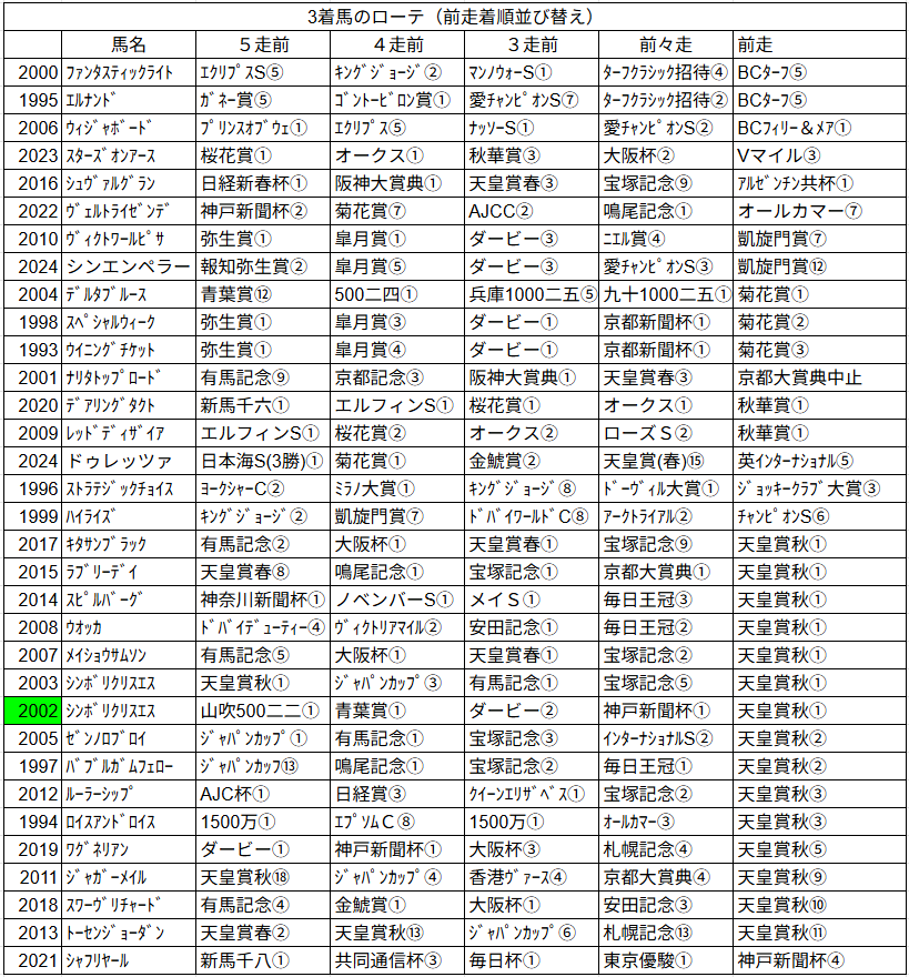 - 間隔は2か月以内(勝ち馬は中6週以内)で、3か月以上空けた馬は去年のスターズオンアース1頭のみ(過去30年)