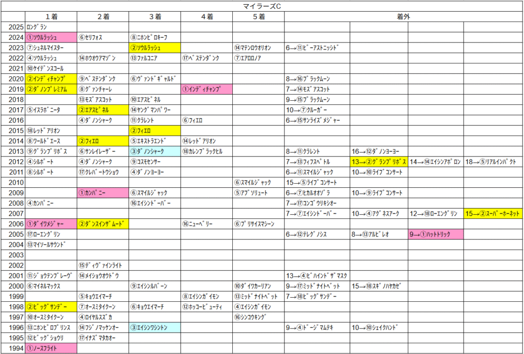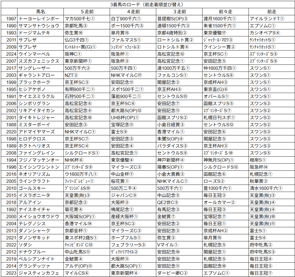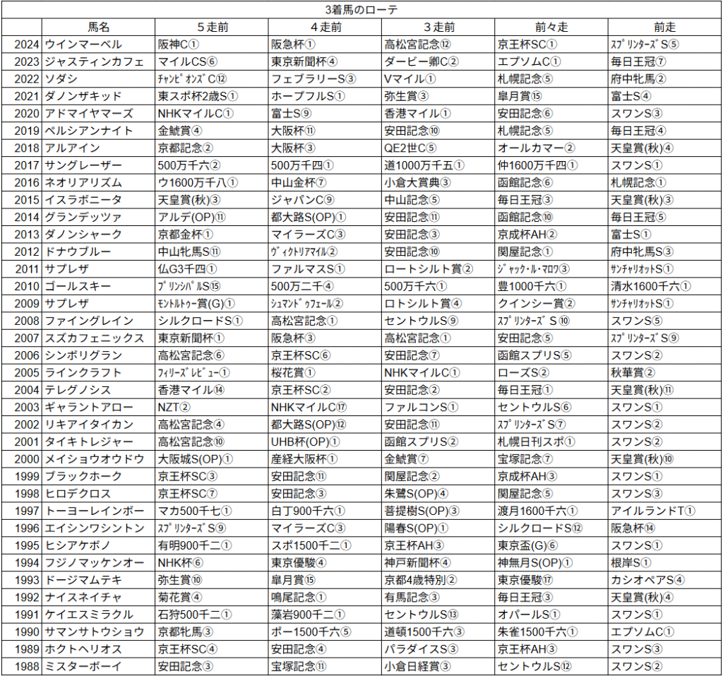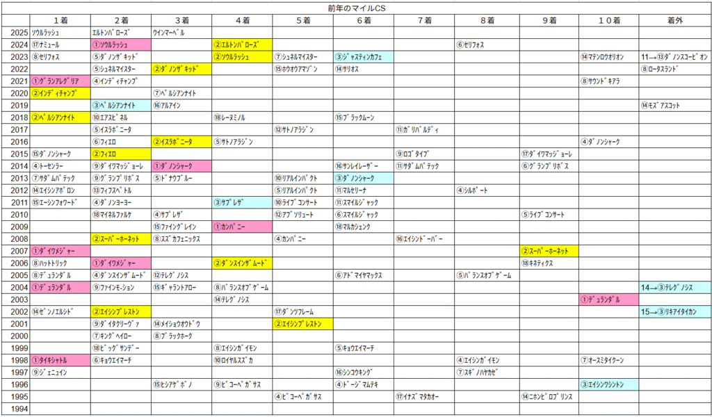 過去1年以内に関西マイル重賞を勝っている馬と前年のマイルCS4着以内はデータ外でも可