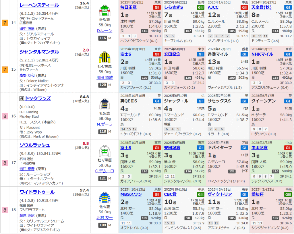 ジャンタルマンタルとソウルラッシュはG1馬で富士S好走からの出走は文句ないでしょう。