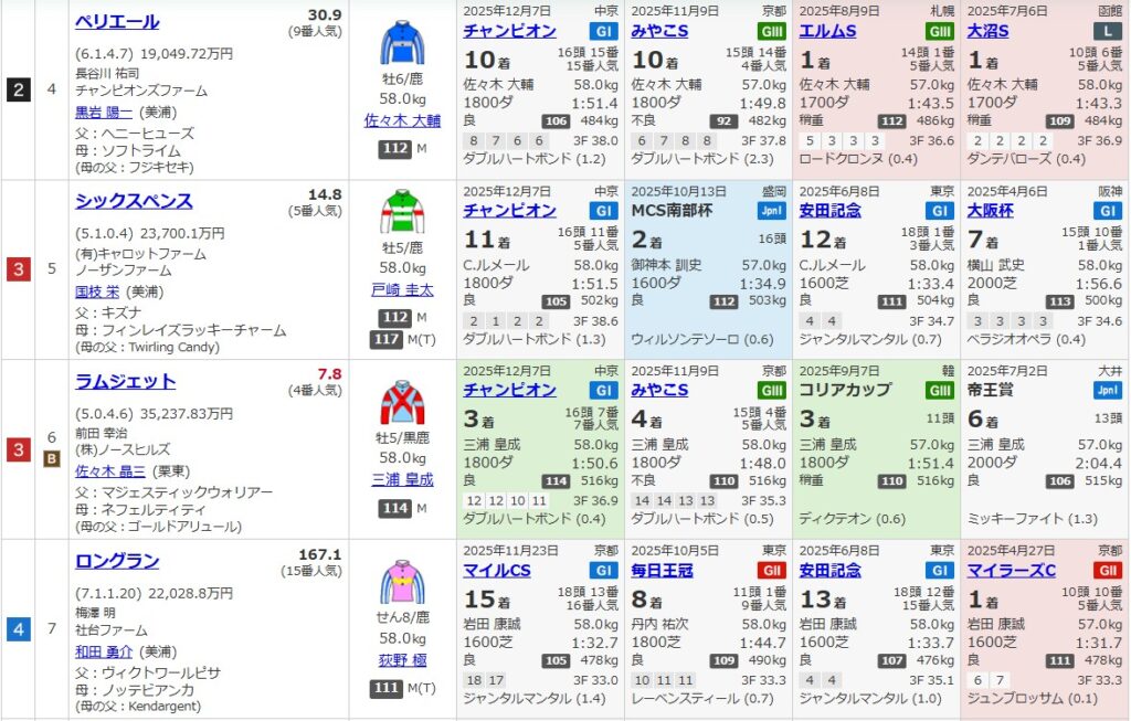 今年も東京大賞典組がおらず、チャンピオンズカップは惨敗組のペリエール、シックスペンス、ペプチドナイル、前走1着のハッピーマン、ロードクロンヌあたりが良いかもしれません。