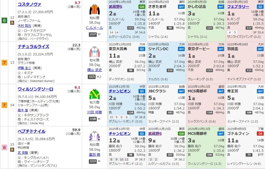 コスタノヴァは武蔵野Sからの直行で厳しいデータになります。着外のオメガギネスやペプチドナイルは武蔵野S着外の後も連対できておらず厳しいでしょう。