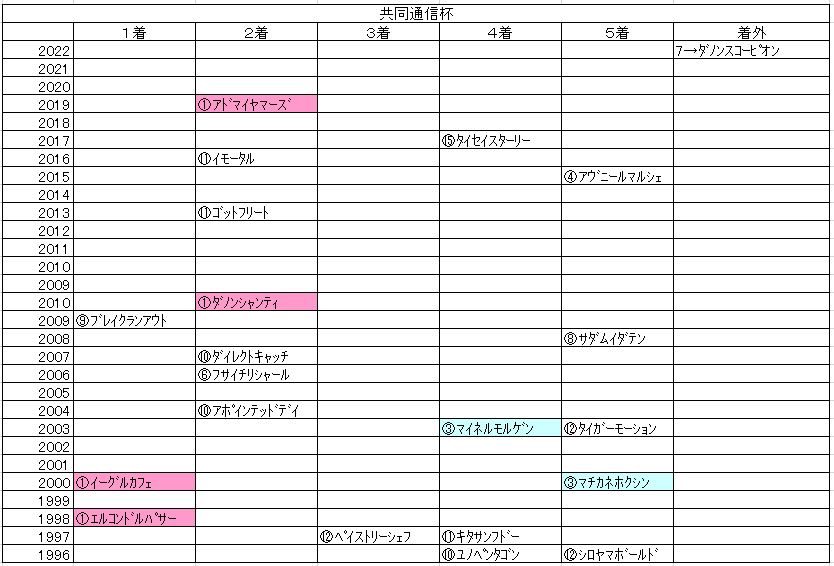 | 2022 | もみじS⑤ | デイリー杯③ | シンザン記念⑧ | 白梅(1勝)千六① | アーリントンC⑪ | カワキタレブリー(2.0.2.4) | (1.0.1.2) |
